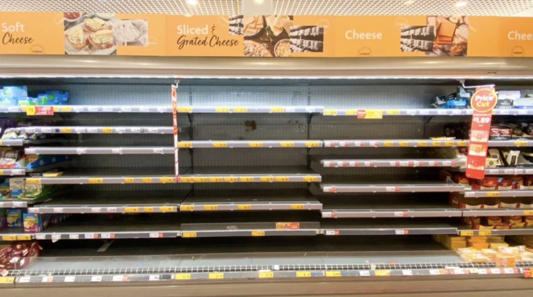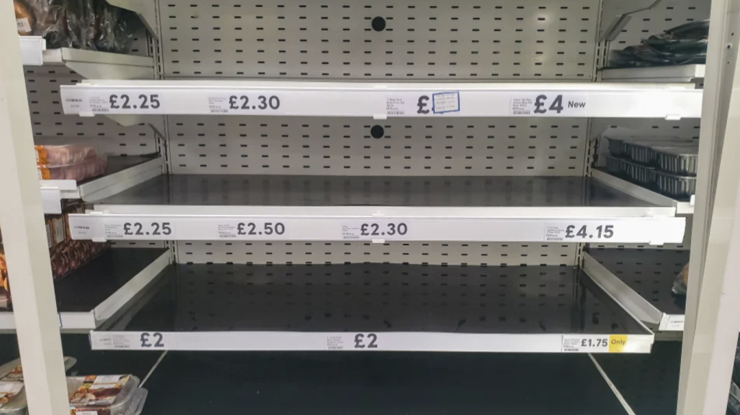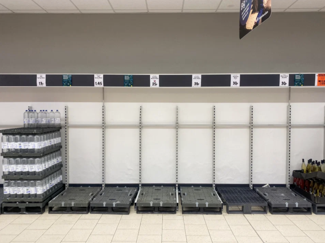 很多购物者在推特上发布了一些英国最大超市的空货架的照片,声称包括比萨、水果和薯片在内的商品长时间出现短缺。