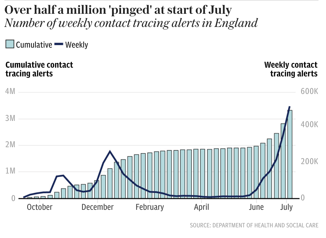 英国近一个月由于NHS app提醒的与确诊/感染患者密接,需要隔离的人数高达618,903人,这严重影响了各大企业、医院、超市等地的工作。