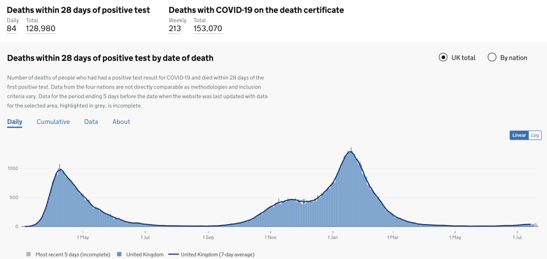 截止至2021年7月22日(周四)英国时间09:00,累计检测结果量232,303,132次(+1,038,954);累计确诊5,602,321例(+39,906);累计病亡128,980(+84)。