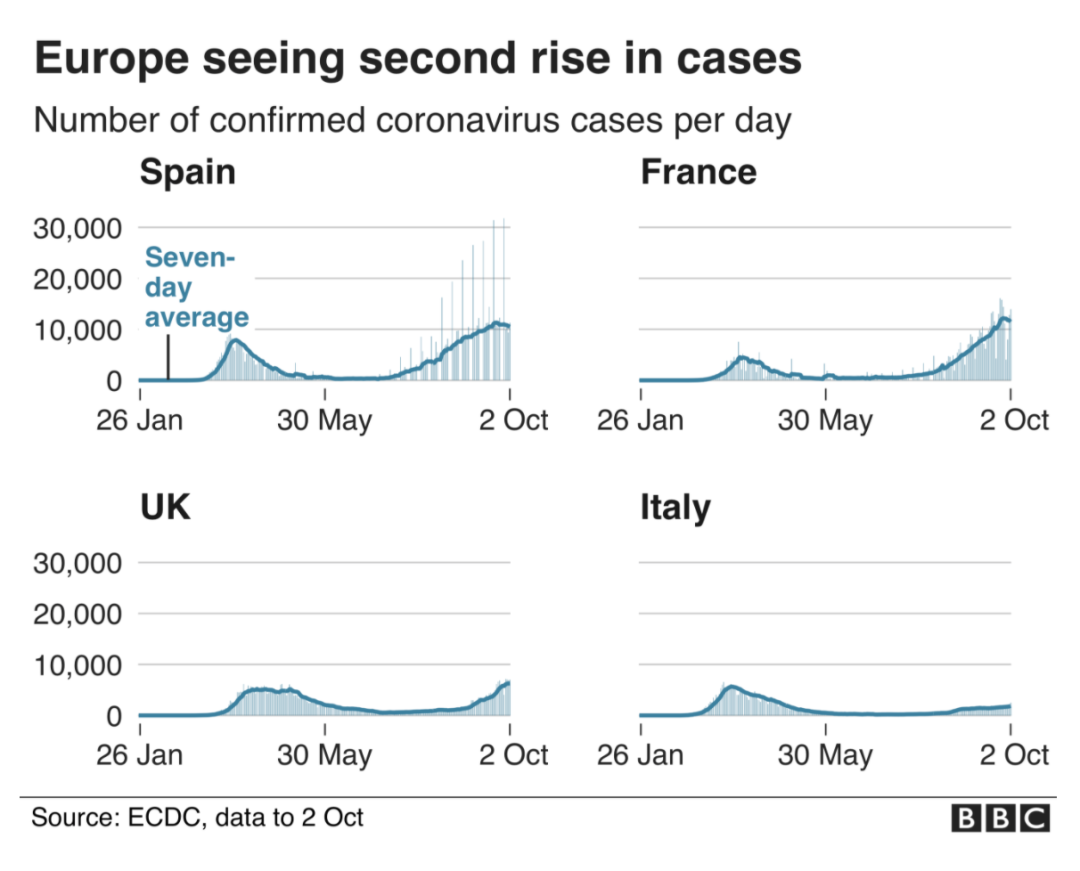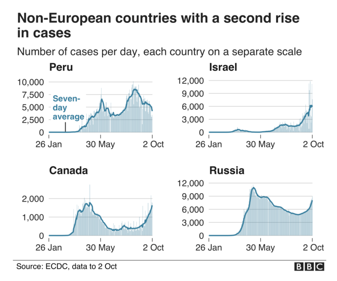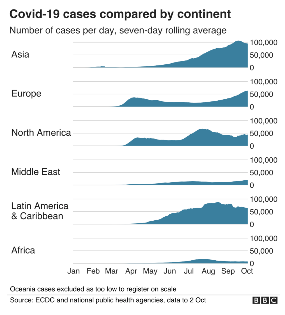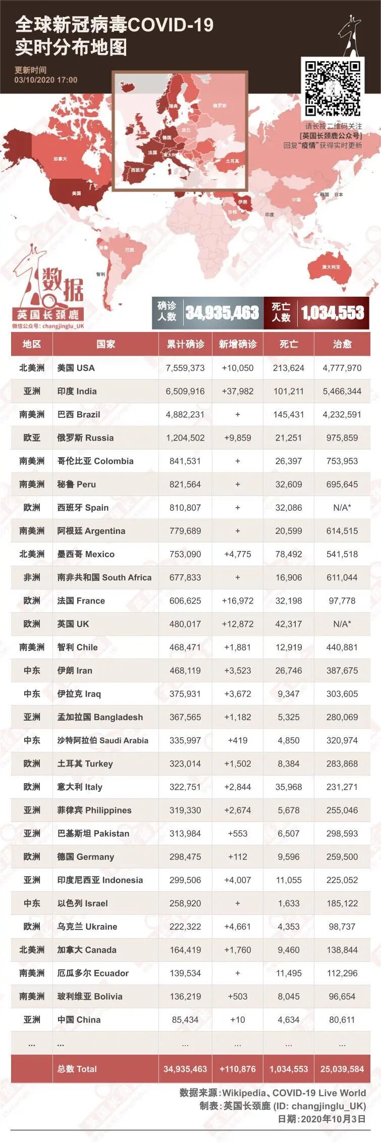 世界的累计确诊人数截止10月3日17:00超过3,362万例(+370k),死亡超过102.9万例(+9k)。