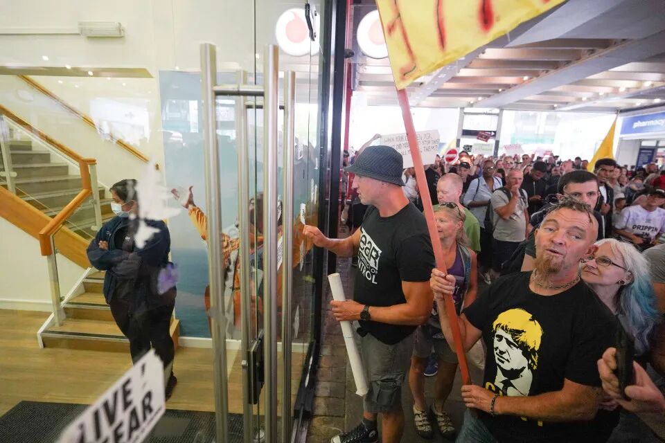 7月25日(周日),反对疫苗抗议者聚集于曼彻斯特Trafalgar Square,试图闯入附近的一个新冠病毒测试中心。曼彻斯特出动多名警察与抗议者对峙,阻止抗议者冲入建筑。