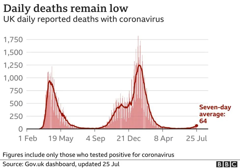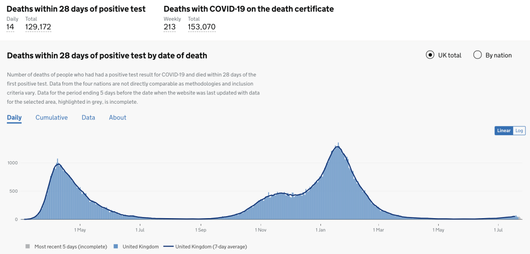 东英吉利大学的Paul Hunter教授表示:目前的数据看起来至少在夏天是不错的。但是大家需要注意,目前的数据当然不包括7月19日解封后,结束限制的任何影响。至于解封对数据的影响,大约要到本周五开始,才会在新增数据中显示出来。