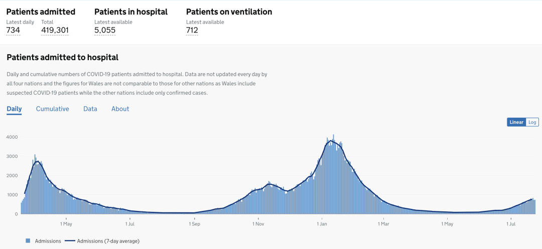 截至7月22日,全英国有5,001名新冠患者住院,比5月27日的最低点871人有所上升,但仍远低于1月份冬季疫情高峰时的39,254名新冠住院患者。