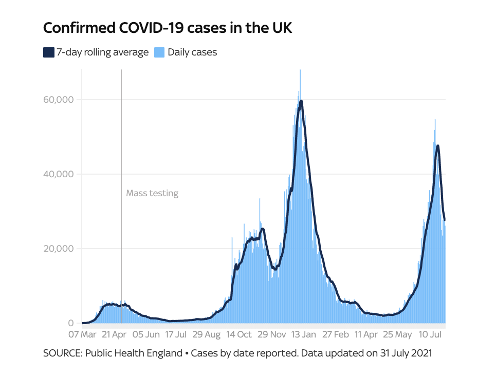 近日英国日增确诊已经远远低于第三波疫情7月中旬的峰值,这是否意味着第三波疫情已过拐点呢?这不仅让大众疑惑,连续一个多星期的持续下降趋势,周平均新增比前一周下降33%,也同时让科学家们感到困惑,毕竟没有明确的原因导致如此突然的转变。