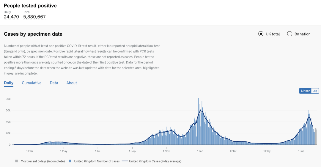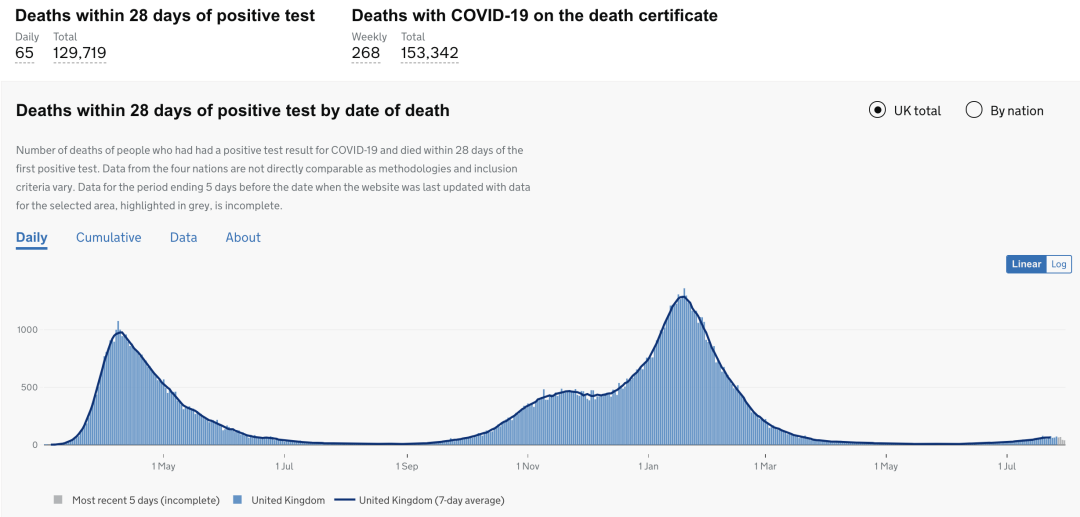 截止至2021年8月1日(周日)英国时间09:00,累计检测结果量239,643,446次(待更新);累计确诊5,880,677例(+24,470);累计病亡129,719(+65)。