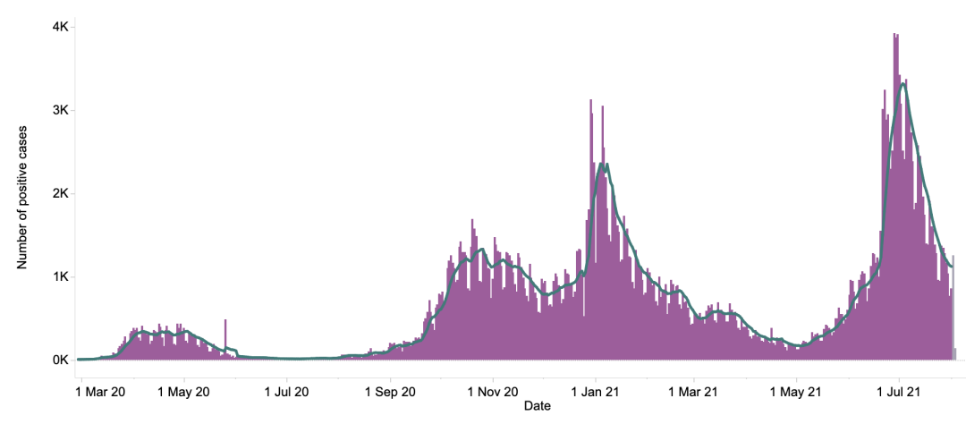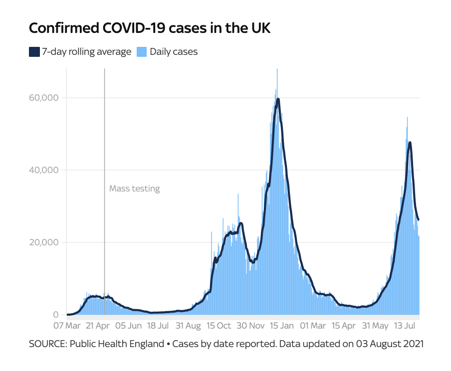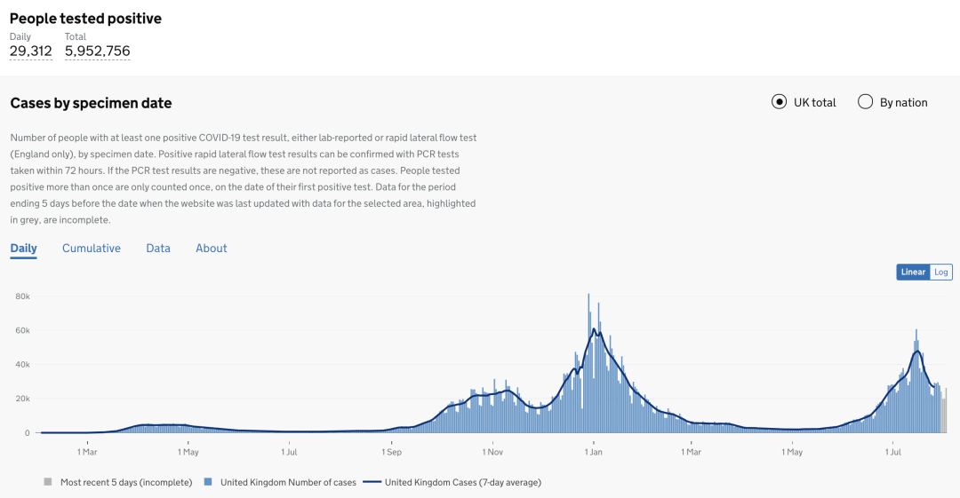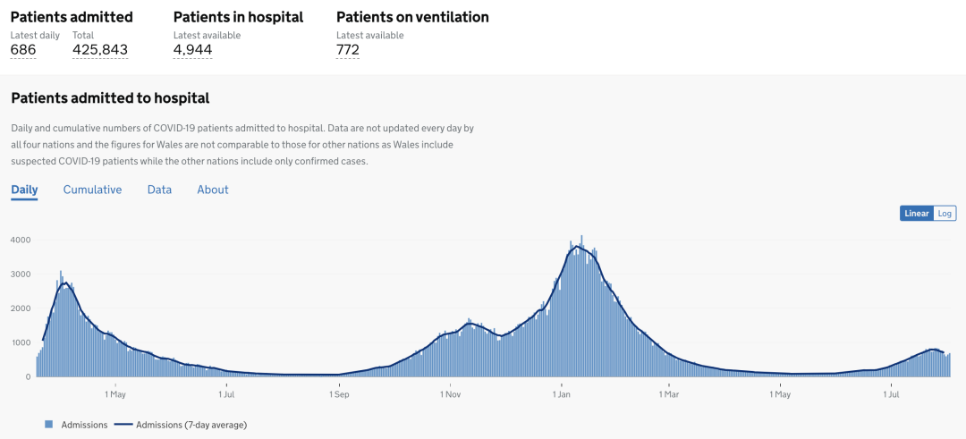 截止至2021年8月4日(周三)英国时间09:00,累计检测结果量243,512,311次(+720,252);累计确诊5,952,756例(+29,312);累计病亡130,000(+119)。