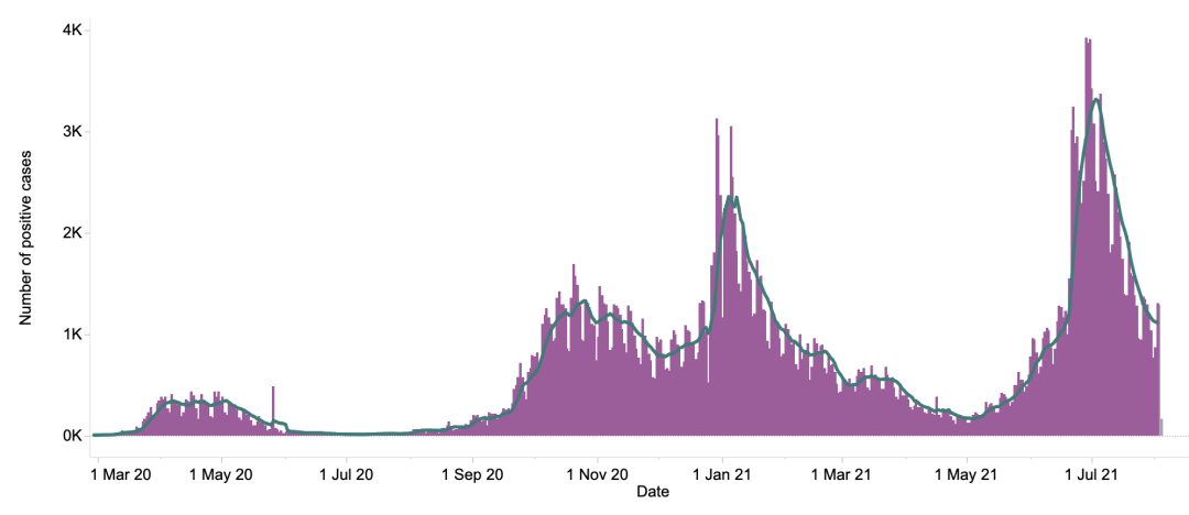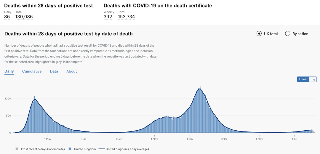 截止至2021年8月5日(周四)英国时间09:00,累计检测结果量244,394,007次(+845,680);累计确诊5,982,581例(+30,215);累计病亡130,086(+86)。