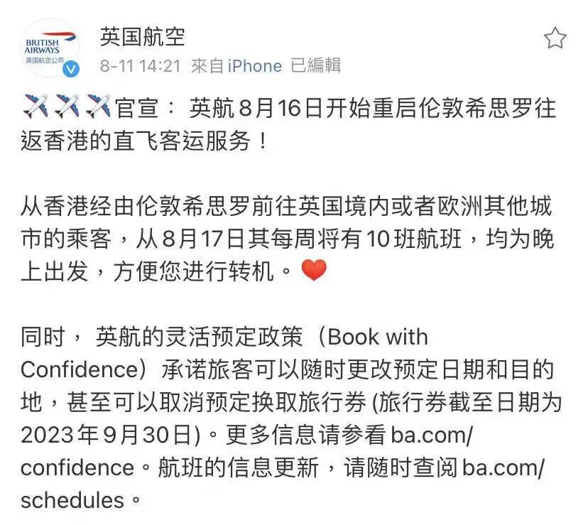 英航(British Airways)也表示将提供灵活的预定政策(Book with Confidence),承诺旅客可随时更改预定日期和目的地,甚至可以取消预定,以换取旅行券(旅行券截至日期为2023年9月30日)。