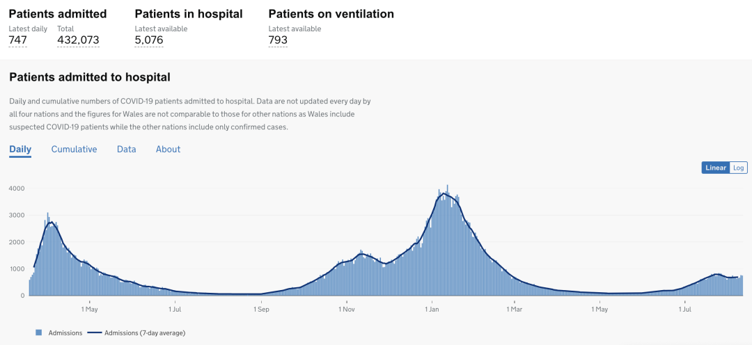8月13日数据:目前住院的确诊新冠患者5,076人(+47),累计住院新冠患者总数为432,073(+747)。