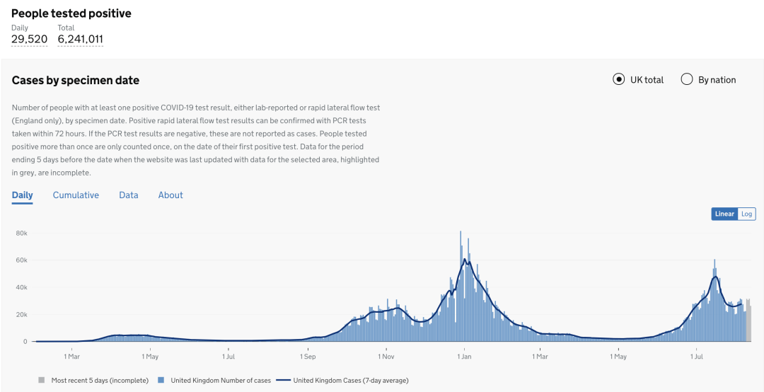 截止至2021年8月14日(周六)英国时间09:00,累计检测结果量26,851,931(+813,378);累计确诊6,241,011例(+29,520);累计病亡130,894(+93)。