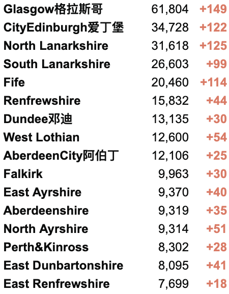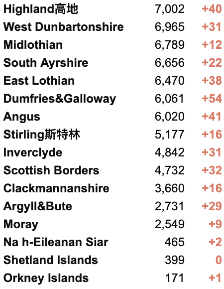 从2020年3月5日以来,苏格兰地区一共有18,225名(+39)确诊患者出院。截至8月13日午夜,近期住院的疑似/确诊新冠患者353名(-3),其中41名(-1)确诊新冠在重症监护室ICU。