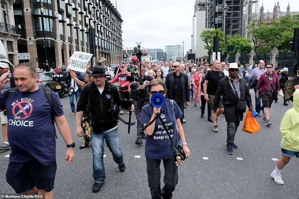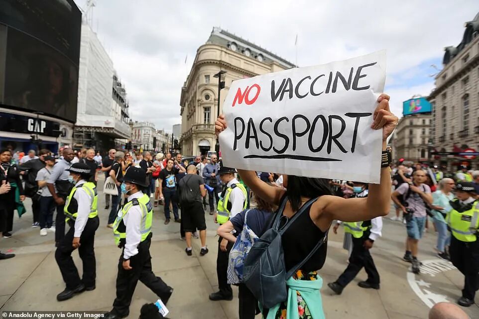 本周末,全国各地举行了有关反对新冠疫苗护照使用的集会。数百人在伦敦和曼彻斯特街头游行抗议。示威者举着“没有疫苗通行证“、”拒绝控制”以及“拒绝强制接种”的牌子。