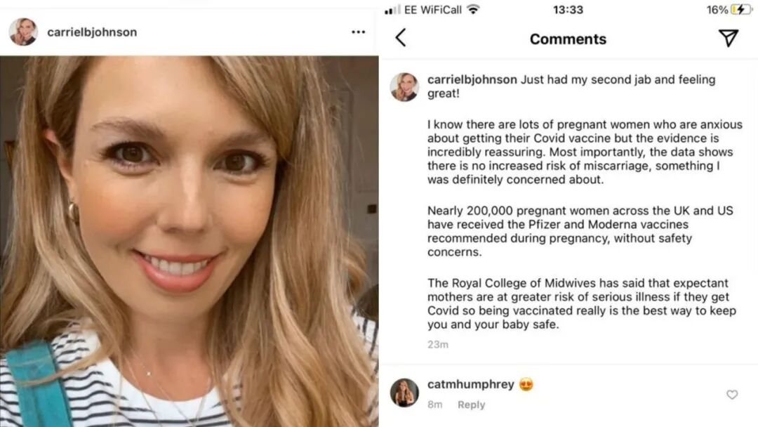 首相夫人卡丽-约翰逊(Carrie Johnson)在8月14日(周六)接受了自己的第二剂疫苗接种后,在其社交媒体上敦促其他孕妇接种疫苗。并称,一开始自己对接种疫苗感到担忧,但数据显示没有因此而流产的风险。