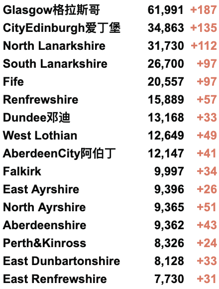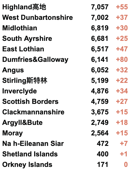 从2020年3月5日以来,苏格兰地区一共有18,225名(+39)确诊患者出院。截至8月13日午夜,近期住院的疑似/确诊新冠患者353名(-3),其中41名(-1)确诊新冠在重症监护室ICU。