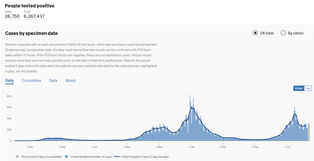 截止至2021年8月15日(周日)英国时间09:00,累计检测结果量26,851,931(待更新);累计确诊6,267,437例(+26,750);累计病亡130,953(+61)。