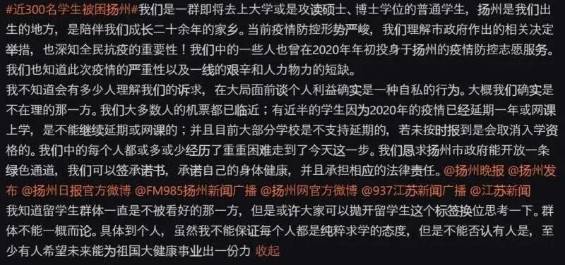 8月4日,一则#近300名学生被困扬州#的“留学生自救”帖子在网上引发关注: