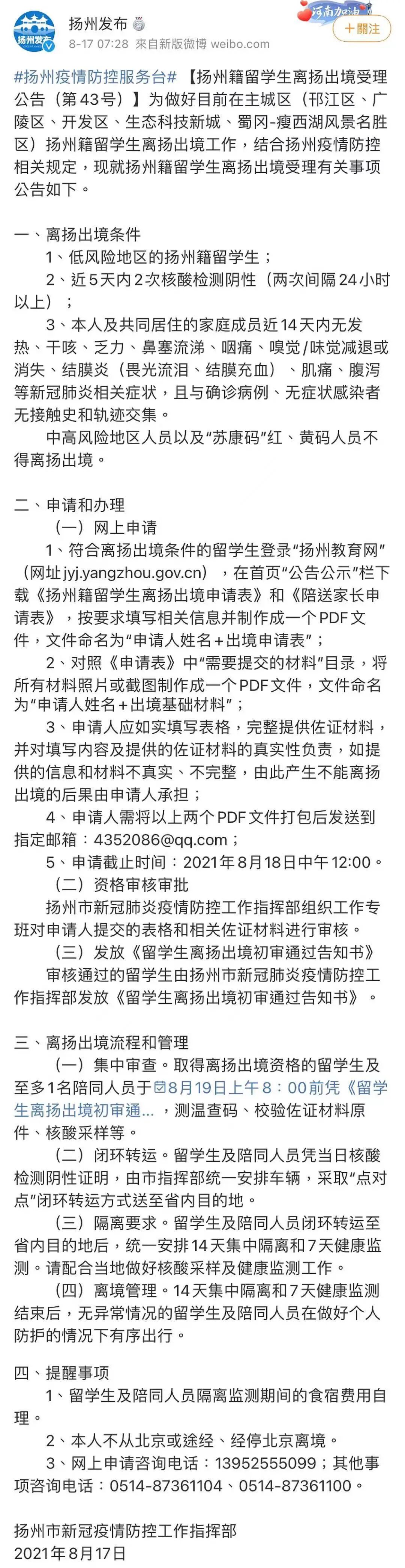 而“14+7”的隔离政策,这意味着即便8月19日通过审核,最快也需9月9日才能离开扬州。