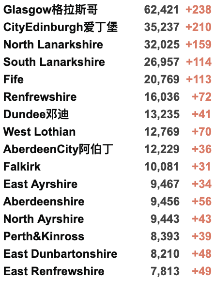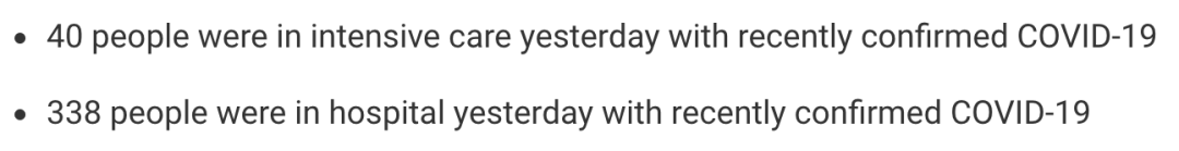 从2020年3月5日以来,苏格兰地区一共有18,340名(+39)确诊患者出院。截至8月17日午夜,近期住院的疑似/确诊新冠患者338名(+1),其中40名(+1)确诊新冠在重症监护室ICU。