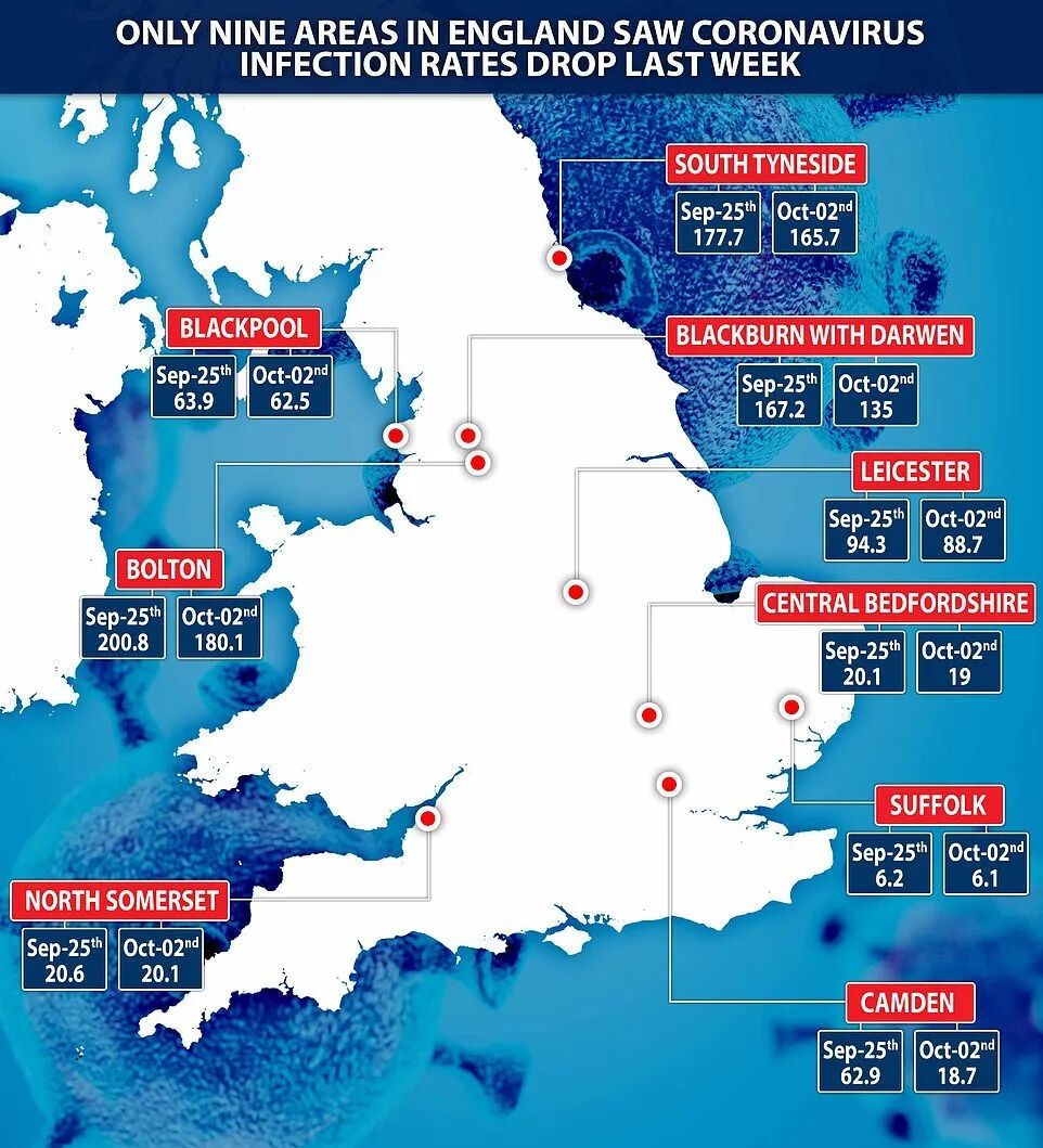 在这9个疫情好转的地区,伦敦的Camden新增下降最多——其感染率下降了70%。它现在也是伦敦32个区中感染率最低的。其他封锁地区,包括莱斯特、Blackpool、Bolton以及South Tyneside的感染率也有所减缓。
