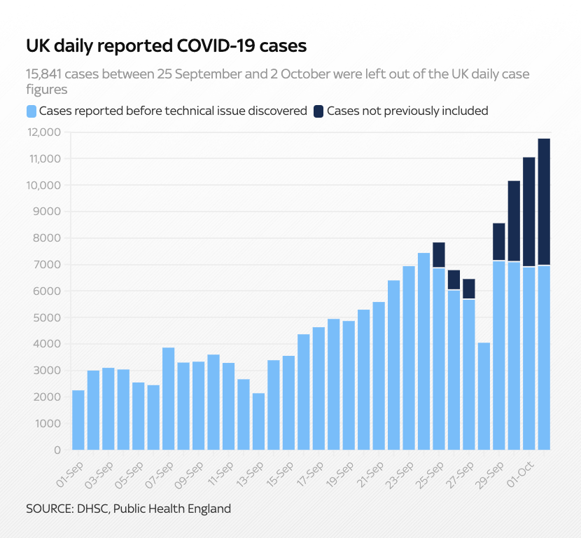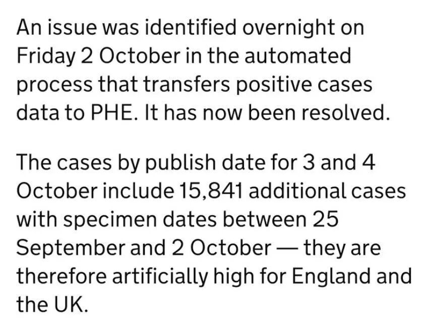 10月4日(周日),英国官方新增确诊公布近2.3万例,但同时官方在系统中还发布了以下这则消息——10月2日(周五),官方发现数据传输系统出现问题,导致9月25日-10月2日之间共有15,841例确诊病例的数据没有登记到每日疫情数据系统当中...