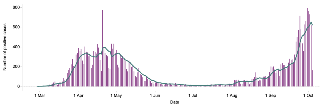 10月5日(周一),据官方数据显示,曼彻斯特目前是英格兰疫情最严重的地区:截至10月1日的一周内,曼彻斯特共确诊2,740例新冠,相当于每10万人495.6例;而其前一周的感染率仅为每10万人223.2例。