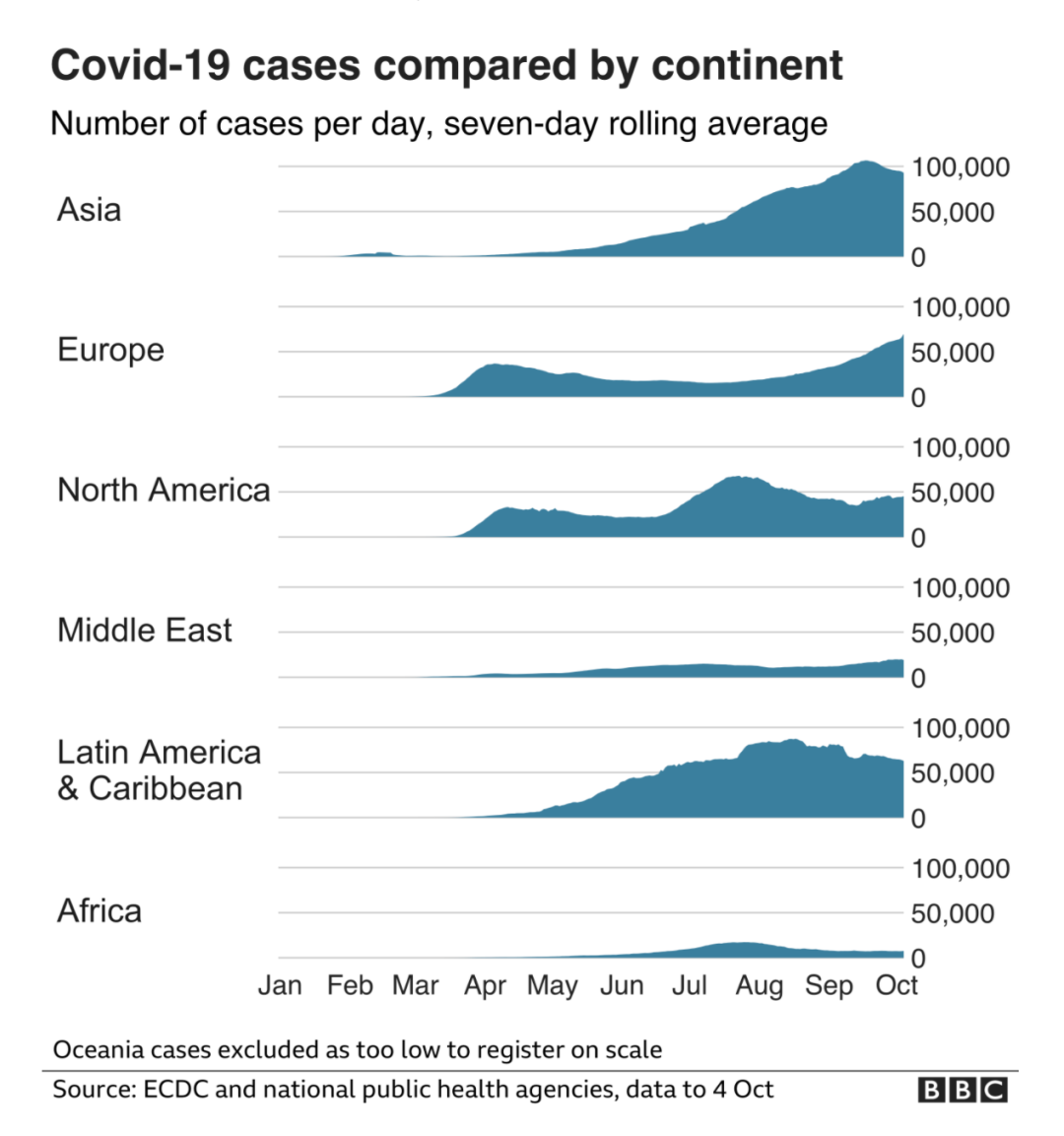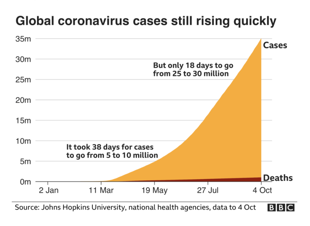 世界的累计确诊人数截止10月5日17:00超过3,552万例(*),死亡超过104.3万例(+6k)。