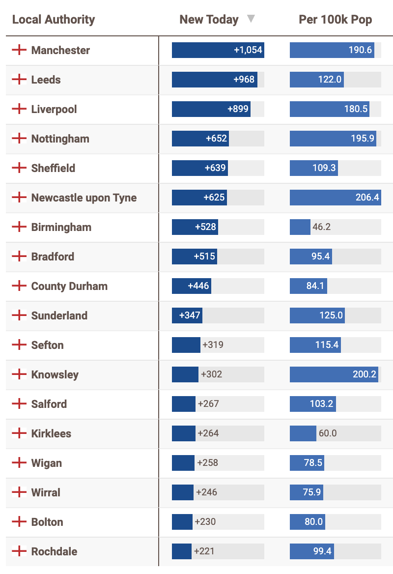 此外,英格兰中部和北部的疫情依然非常严峻——利兹(+968)、利物浦(+899)、诺丁汉(+652)、谢菲尔德(+639)、纽卡斯尔(+625)、伯明翰(+528)等。