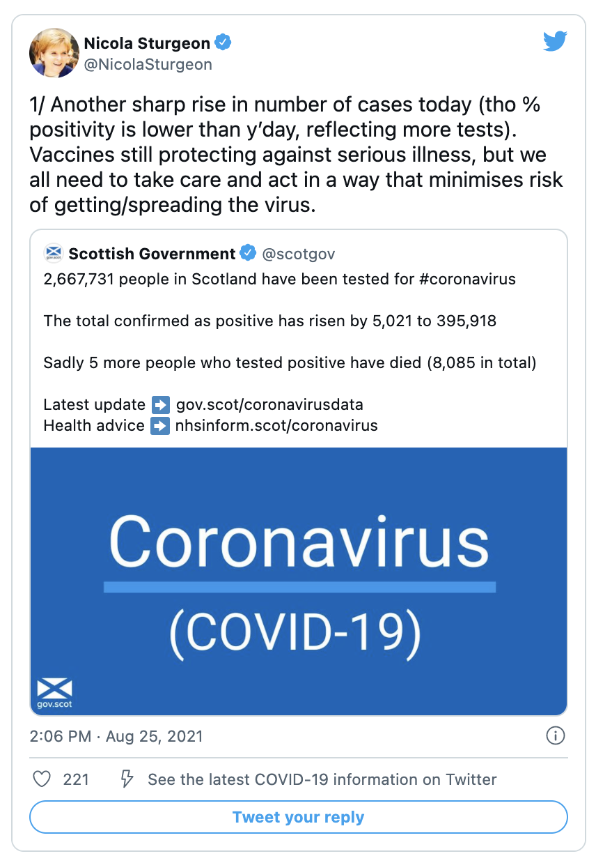 苏格兰首席大臣Nicola Sturgeon因为数据而警告说:尽管在目前这个阶段,重症/死亡水平仍然相对较低,但她不能排除重新实行一些新冠限制和封锁的可能性。