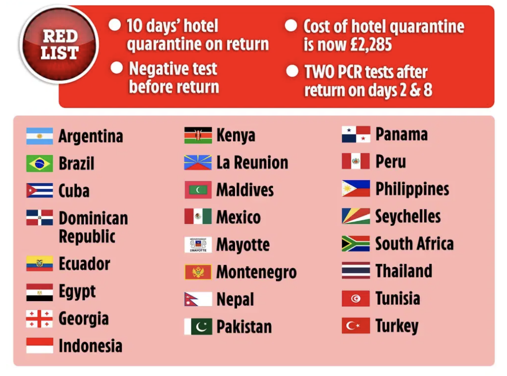 相比之下,Montenegro黑山以及泰国这两个国家都将从下周一开始被英国政府列入红色名单——因为当地新增确诊增加,对公众健康的威胁也随即升高。这也意味着从这两个地方回英的人要进行酒店隔离。
