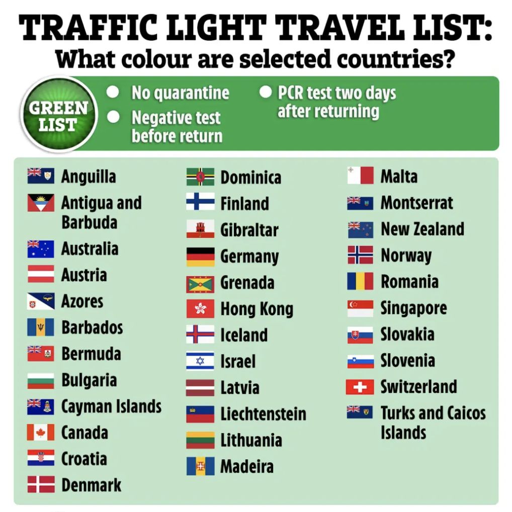 8月26日(周四)英国晚间,英国正式更新交通灯国家名单:从下周一开始,加拿大、丹麦、芬兰、立陶宛、瑞士、列支敦士登和the Azores群岛这7个国家地区将被列入绿色国家名单,即双向免隔离旅行。英国当地人的度假地也多了一些选择。