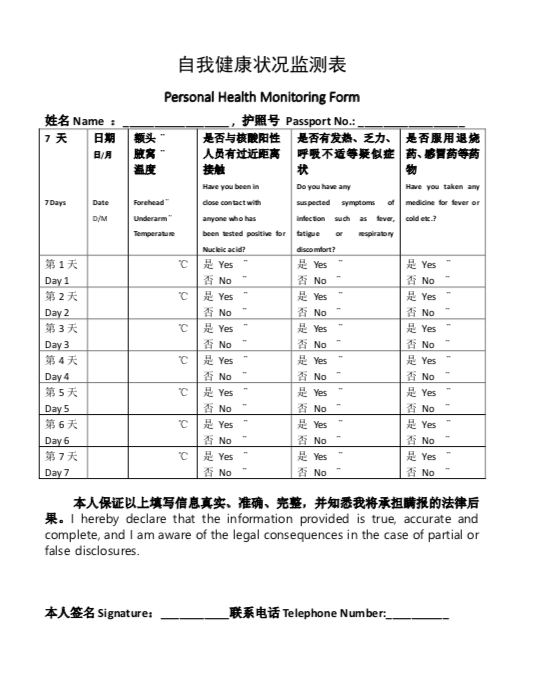 自我健康状态监测表 | 图片信息来源chinese-embassy.org.uk