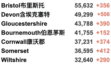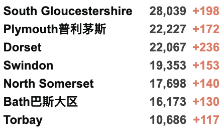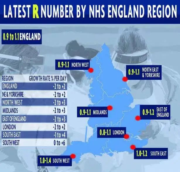 最新的政府数据显示,英格兰的感染率R值已经略微下降到0.9和1.1之间。英格兰西南部目前的R值最高,为1.0-1.4,增长率为0-6%。