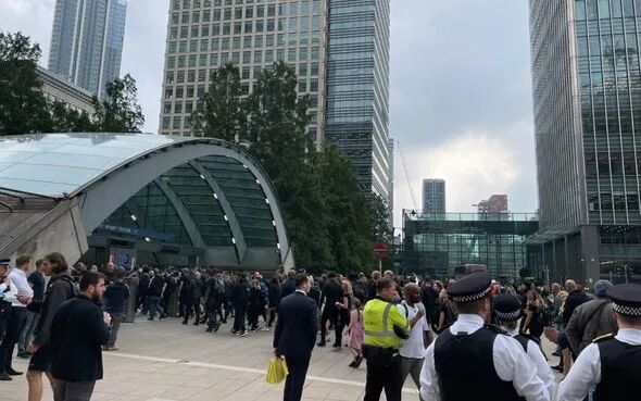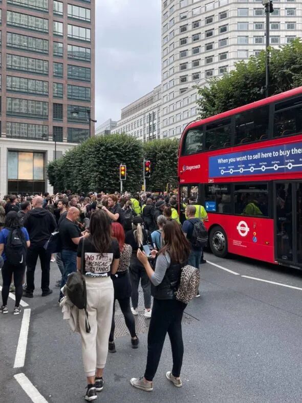 在金丝雀码头拍摄到的画面中,一群警察被挥舞着手机的抗议者包围。警察试图把这群人往后推至大楼门口。