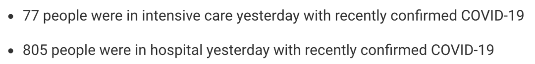 从2020年3月5日以来,苏格兰地区一共有19,417名(+80)确诊患者出院。截至9月7日午夜,近期住院的疑似/确诊新冠患者805名(+34),其中77名(+6)确诊新冠在重症监护室ICU。
