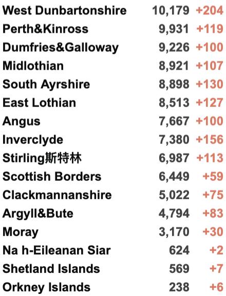 根据ECDC官方数据显示:按最近新冠感染率对242个欧洲地区进行的排名中,欧洲前11名当中苏格兰地区占据了8位。其中,打格拉斯哥地区排名欧洲第三,爱丁堡所在的Lothian地区排名欧洲第五。只有苏格兰的外围岛屿排名在欧洲的前25个地区之外。