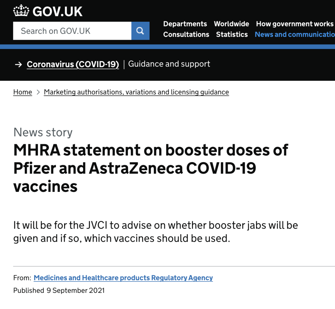 9月9日(周四),英国医疗监管机构MHRA正式批准了辉瑞和你近/阿斯利康的新冠疫苗作为加强剂的使用。但表示,至于何时/对哪些群体进行接种还要等待官方的定夺。