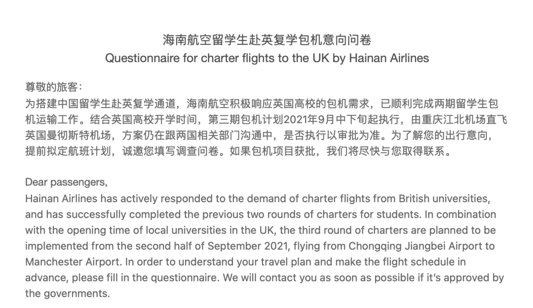 为满足开学季留学生的赴英航班需求,海南航空曾经两次次发布了有关2021年9月下旬包机计划意向调查问卷: