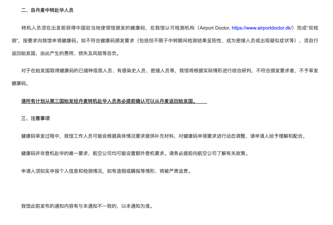 据悉,这篇通知中对于在丹麦当地转机赴华的旅行者有特别的提示,包括: