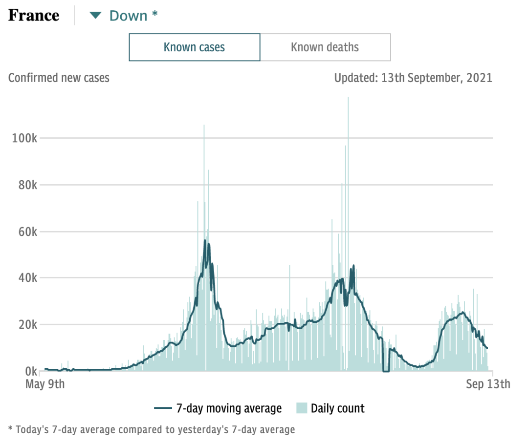 此外,在过去一周,法国新增确诊的7日移动平均数自7月20日以来首次降至1万以下,日增确诊数量连续第三日保持在1万以下。