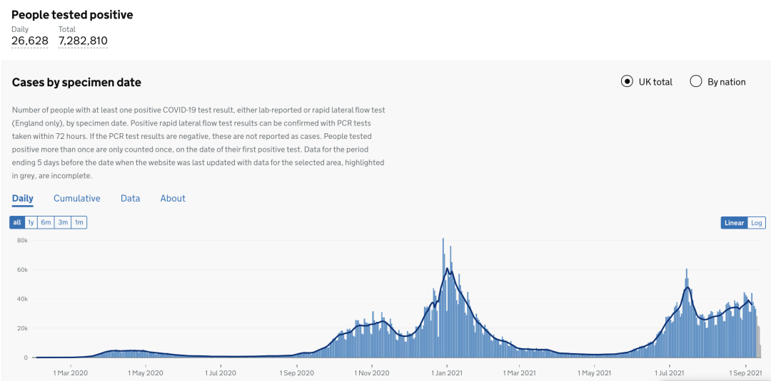 截止至2021年9月14日(周二)英国时间09:00,累计检测结果量281,728,876(+1,043,118);累计确诊7,282,810例(+26,628);累计病亡134,446(+185)。