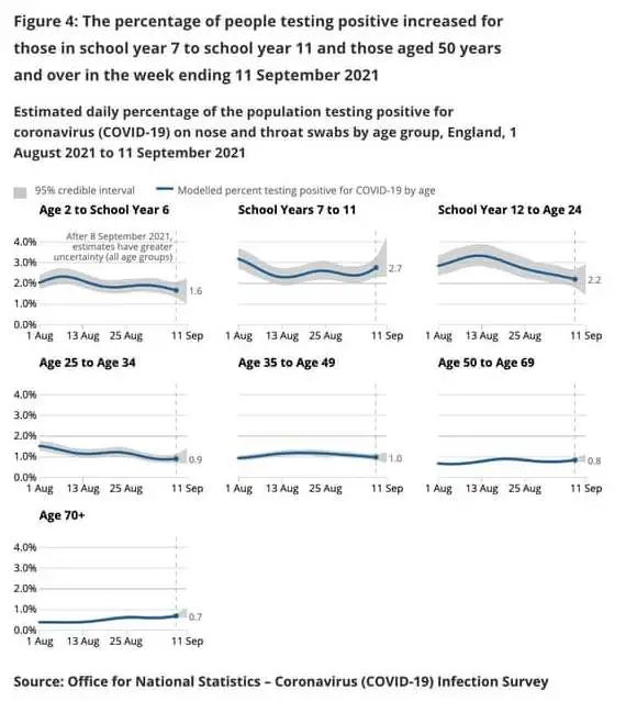 新冠感染调查的分析产出主管Sarah Crofts说,“中学的年轻人的感染水平最高,我们已经开始看到秋季返校产生的影响。“