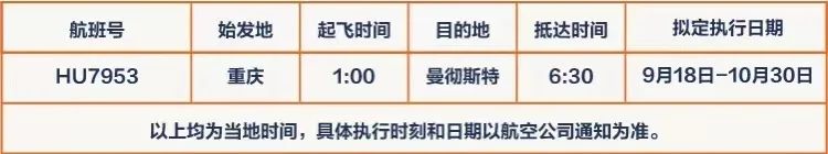 开学季来临,海南航空承包的英国41所高校包机计划终于获批,预计自2021年9月18日起开始执行重庆直飞曼彻斯特包机: