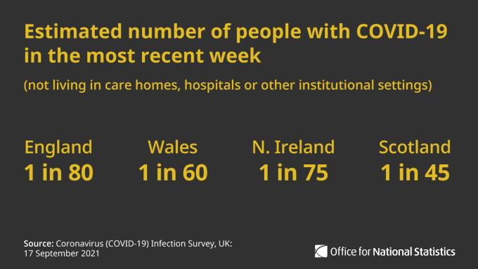 根据国家统计局的数字,在截至9月11日的一周内,英格兰估计每80人中就有1人感染新冠,相对于前一周略有下降,而其他三个地区的比率却在增加。