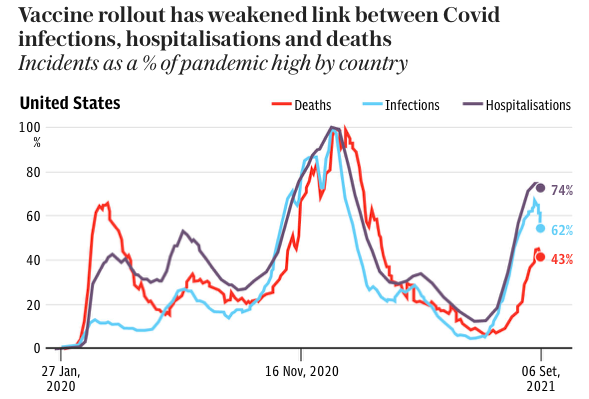 疫苗的推广已经削弱了新冠感染和住院、死亡之间的联系