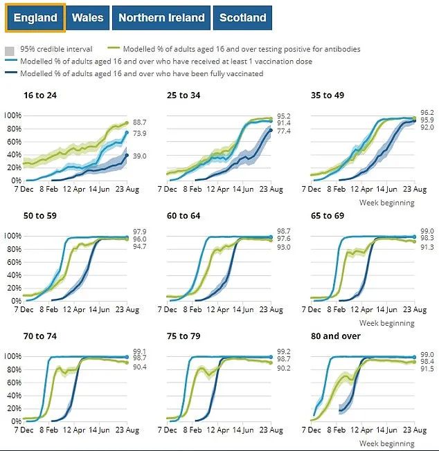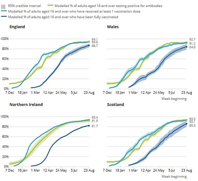 12月7日至8月23日期间英国四个地区16岁以上人群中新冠抗体检测呈阳性的比例 | 信息来源Dailymail