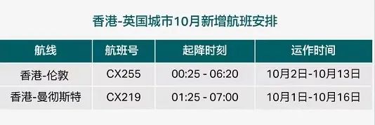 昨日(9月17日)国泰航空公布了10月前往英国的增加航班计划——在原有前往伦敦和曼彻斯特的航班基础上,新增10月2日-10月13日前往伦敦的CX255航班以及10月1日-10月16日每天前往曼彻斯特的航班。