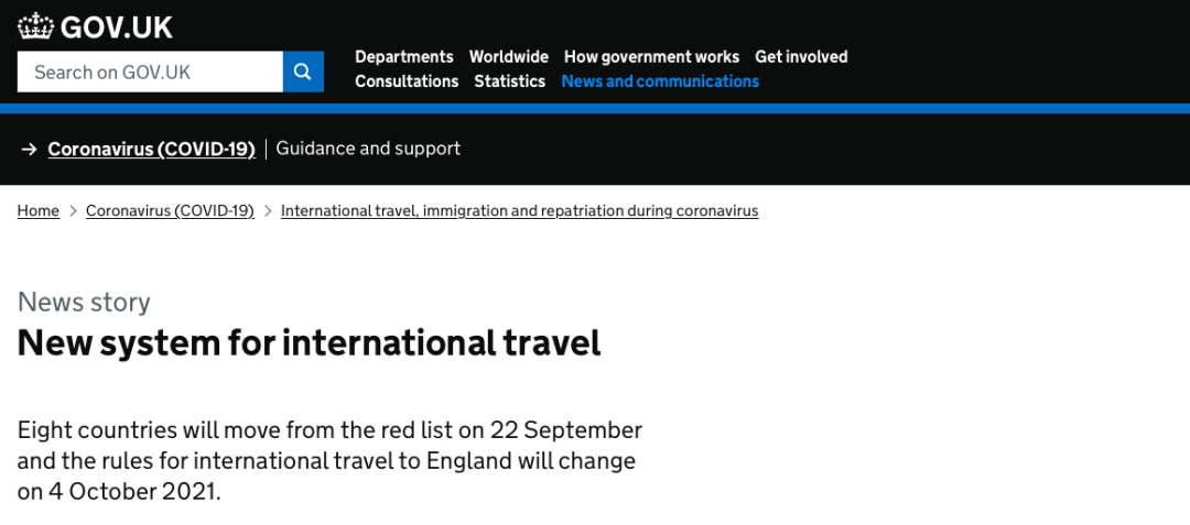 根据英国政府信息,该新规则仅适用于入境英格兰地区。苏格兰、威尔士、北爱尔兰的入境规则还未更新。