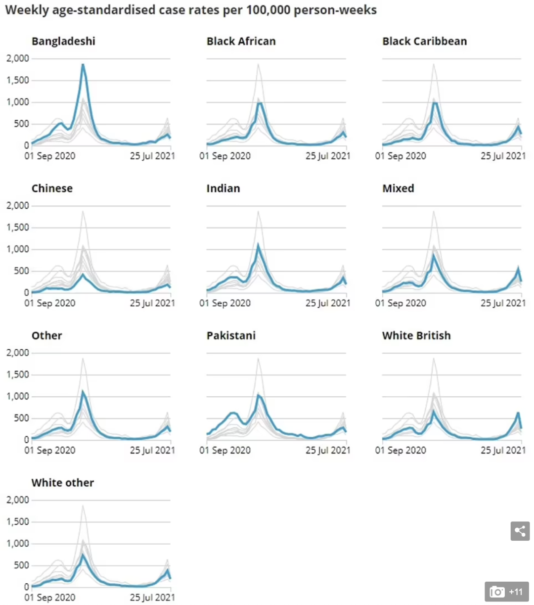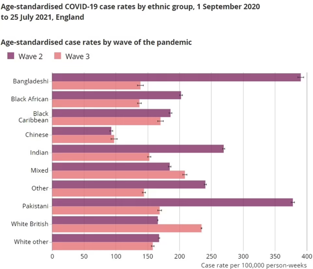 值得注意的是,相对第2波疫情来看,英国白人群体的感染率在第3波疫情当中反倒上升不少。这和大家放松警惕,不佩戴口罩,回归大规模聚集的演唱会、球赛等娱乐项目有直接关系。