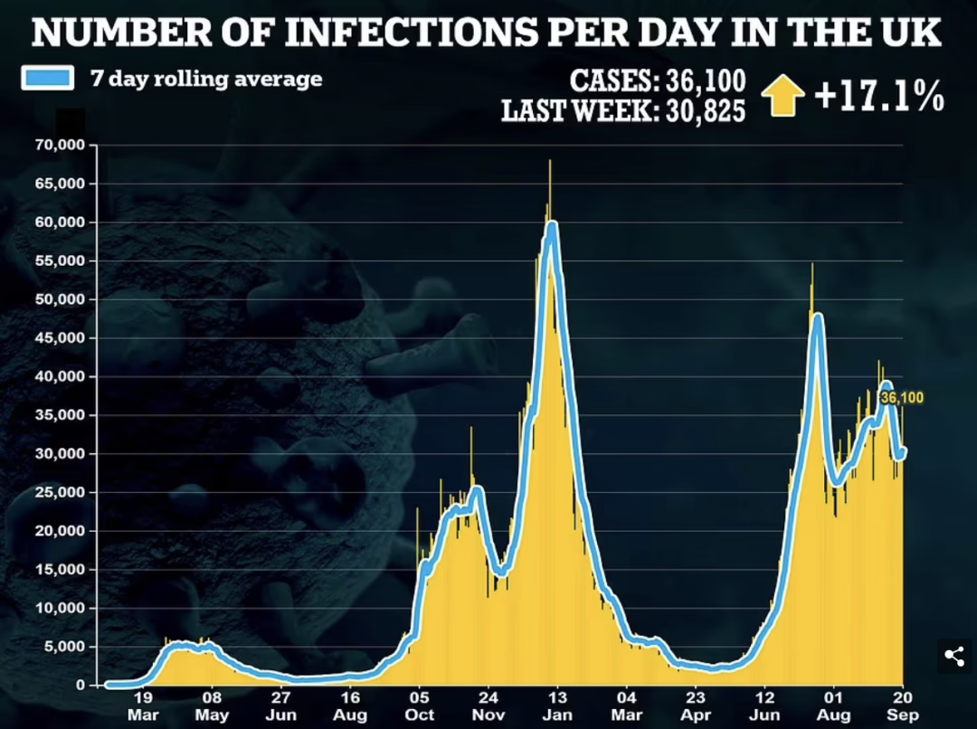 9月20日(周一),英国日增新冠确诊再次经历了近两星期以来首次大幅上升,在过去24小时内有36,100个新感染病例,比上周一的数据增加了17%。