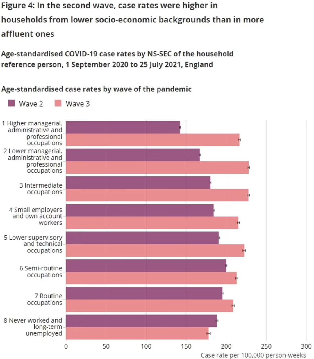 英国官方还公布了不同种族和职业的群体在英国第2、3波疫情当中的表现。